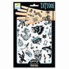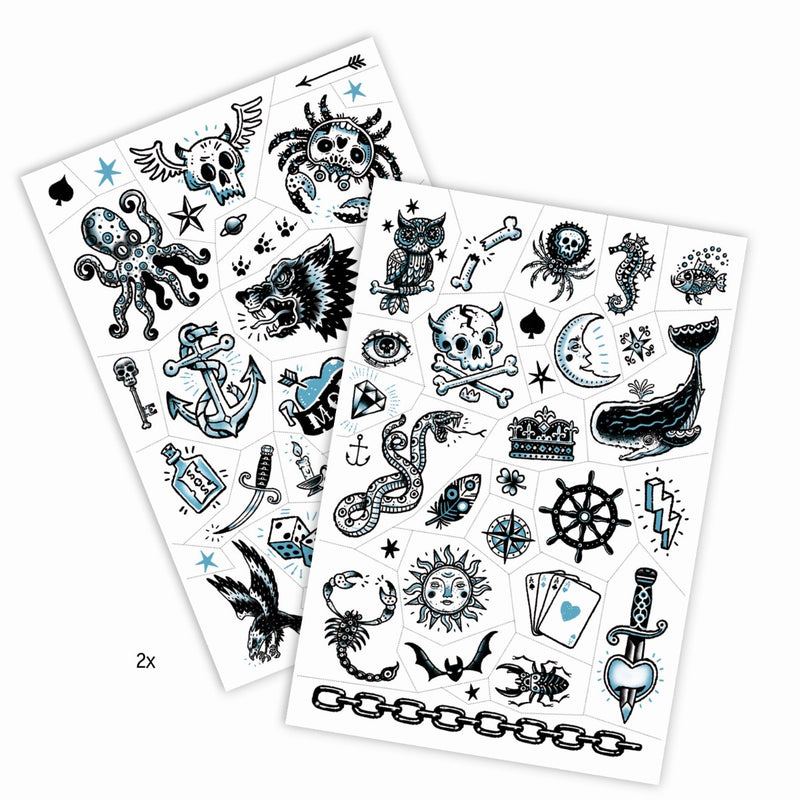 Flotte tatoveringer helt holdt i sort og blå. Indeholder 2 ark med motiver. Udklip det ønskede motiv og fjern filmen. Sæt motivet på huden og dup let med vand. Tatoveringerne er dermatologisk testet.