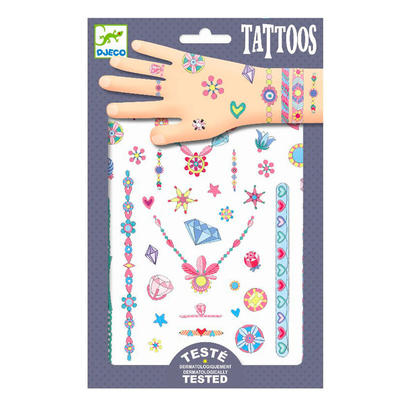 Fantastiske tatoveringer fra Djeco med flotte smykker og figurer. Indeholder 2 ark fyldt med farverige motiver og neon detaljer, som er nemme at anvende. Udklip det ønskede motiv og fjern filmen. Sæt motivet på huden og dup let med vand. Tatoveringerne er dermatologisk testet.