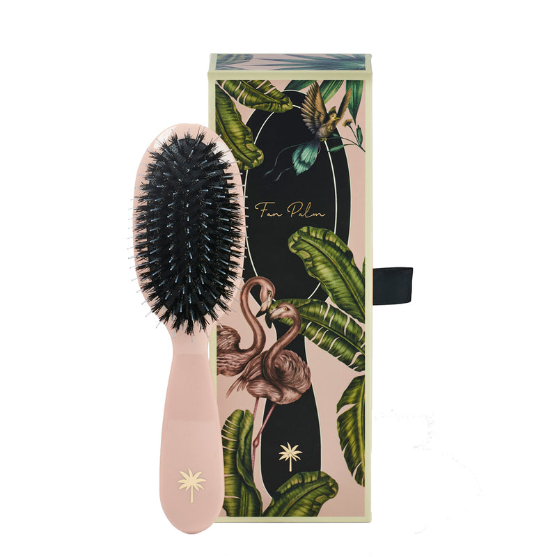 Lille luksus hårbørste fra Fan Palm. Hårbørsten er lavet af en blanding af bløde og skånsomme vildsvinehår og afrundede nylonbørster. Denne kombination stimulerer hovedbunden og transporterer hårets naturlige olier ud i længderne samtidig med, at håret får en naturlig og glansfuld finish. Man opdager hurtigt, at hyppigheden af hårvask kan reduceres til hver tredje eller fjerde dag.