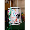 På paptønden er der motiver af katte, som gør tønden mere festelig. Du kan naturligvis udsmykke paptønden med meget mere pynt, maling eller noget helt tredje.