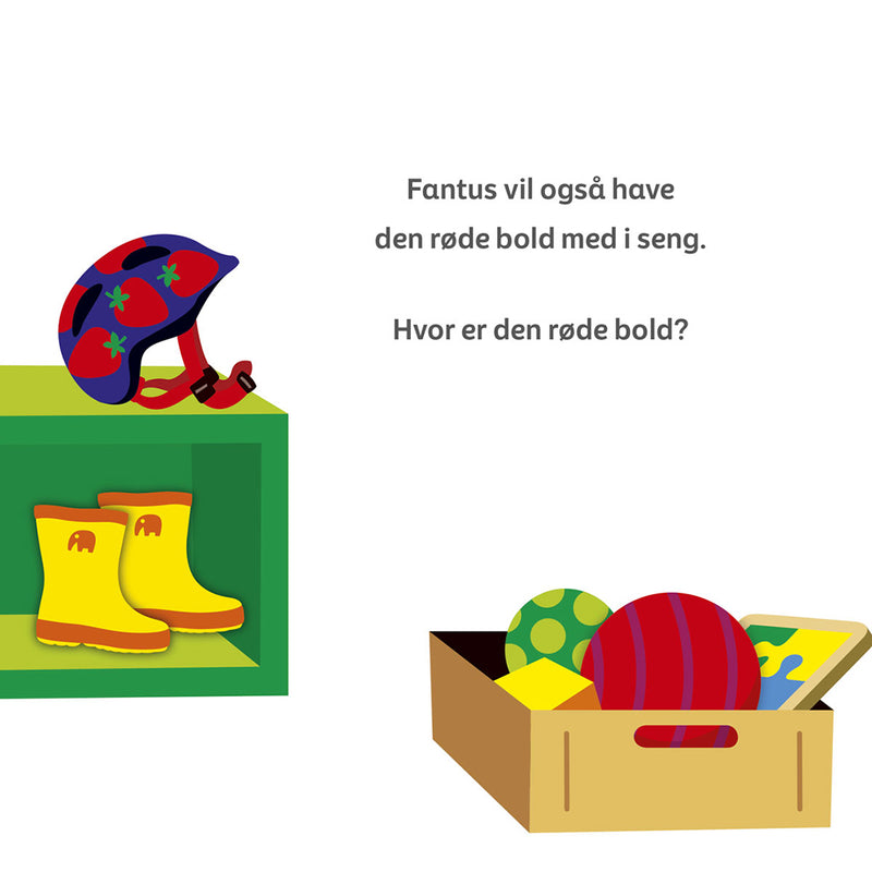 Fantus skal i seng og sove, men skal bare lige finde noget …Fantus vil have bamsen og sutten med i seng – og suttekluden. Og så vil Fantus have bolden og cykelhjelmen… og gummistøvlerne … Men til sidst er der slet ikke plads til Fantus!