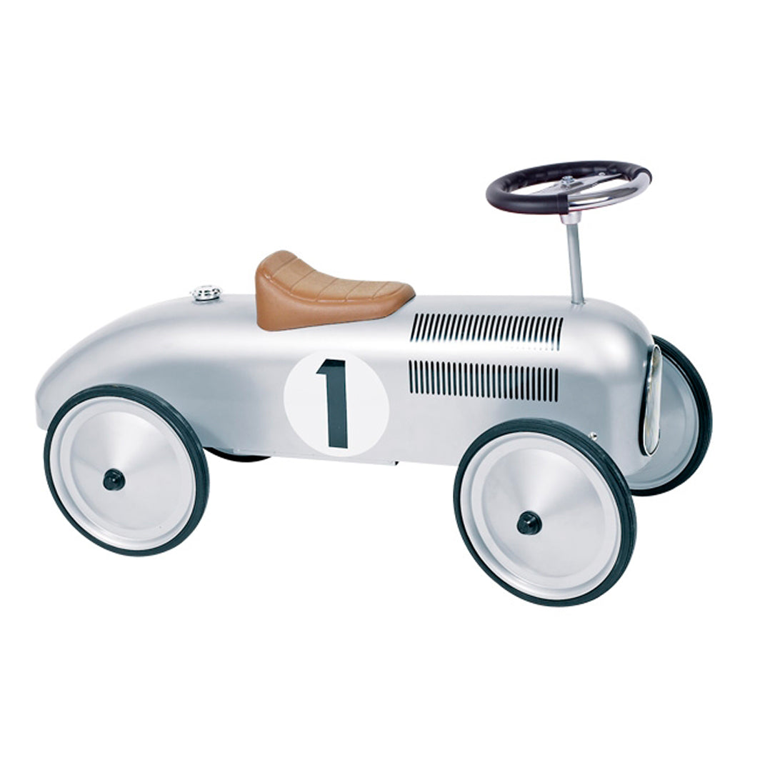 Her er den ultimative gå-racerbil, i flot sølvgrå farve, som uden tvivl vil vække jubel hos både junior og far. Bilen er i autentisk design fra da farfar var barn, og suser afsted ved hjælp af egen benkraft.... Bilen er i metal med gummihjul, og har sæde i hård plastik.