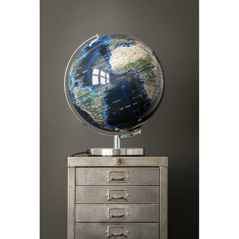 Lampen drives ved hjælp af USB-kabel og strømadapter medfølger. Globussen har tydligt markerede lande, byer, hav og anden geografisk information. Står på en kraftig fod af rustfrit stål.