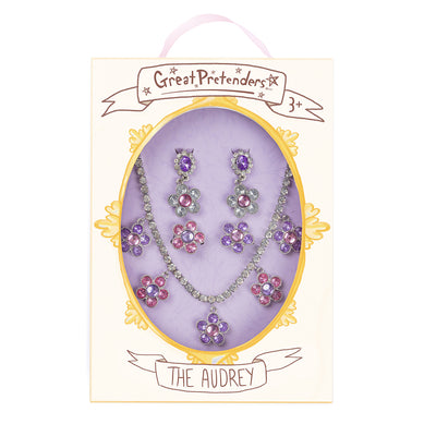 The Aundrey fra Great Pretenders er fint smykkesæt til leg og udklædning. Hvad enten man drømmer om at være prinsesse eller fotomodel, er tilbehør en vigtig ting for at fuldende looket. Dette sæt består af 2 øreringe, 2 fingerringe samt en halskæde. Leveres i æske med gennemsigtigt låg, som gør det til en særlig fin gaveide. Fra 3 år.