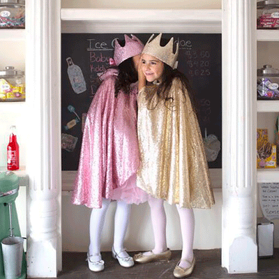 Yndig guldfarvet prinsessekåbe med mange flotte detaljer fra Great Pretenders. Kåben er i polyester overstrøget med glitter og er i en flot lang model m. hætte, der er perfekt over en prinsessekjole. Fås i størrelse: US 4-6 år.