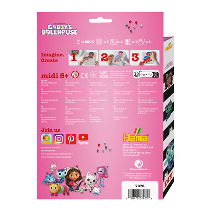 De fleste børn kender serien om Gabby"s Dukkehus. Serien handler om den den entusiastiske katteelsker Gabby og hendes ven Pandy Pote, der drager ud på en række eventyr. Denne ophængsæske indeholder ca. 2000stk. midi perler i ass.farver, 1 stor firkantet stiftplader nr. 234TR, et motiv ark med farver samt instruktioner og strygepapir.