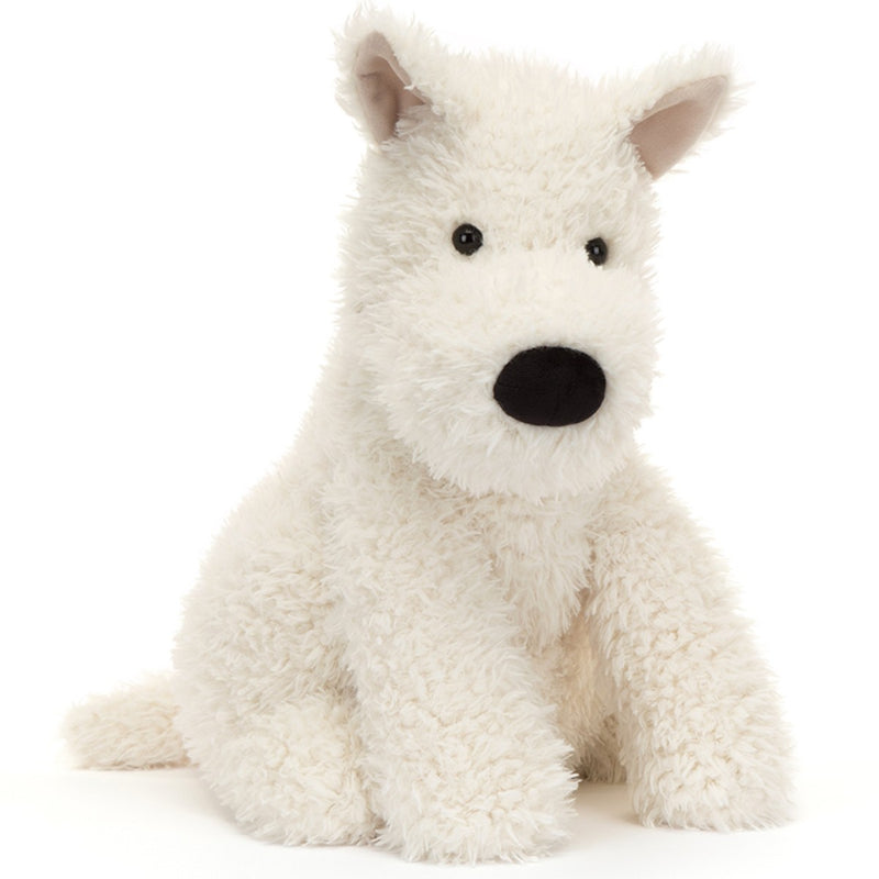 Denne hvide og bløde terrier fra Jellycat vil med garanti blive favorit fra dag et af. Her er han i en stor flot størrelse på 42 cm, og vi kan godt røbe at han er rigtig blød og ideel at putte med for barnet, når der skal soves og trøstes.