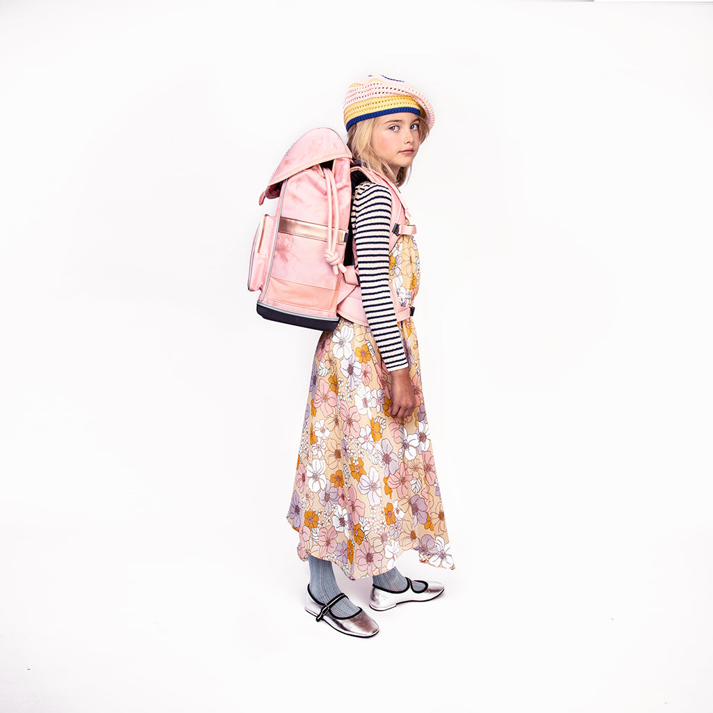 Specifikationer: Skoletasken har flaplukning og snørelukning øverst, 2 store rum der passer til ringbind, lomme til bærbar computer, ekstra indvendig opbevaringslomme med lynlås, en sidelomme til drikkedunk, frontlomme og sidelomme med lynlås, navneskilt, High-end justerbart bæresystem (rygstøtte i henhold til barnets højde), justerbar polstret hoftestrop med kliklås,som er aftagelig, samt justerbare og polstrede rygstropper. Alle materialer er 100 % veganske.
