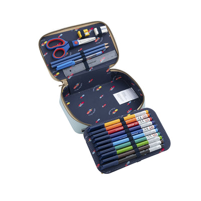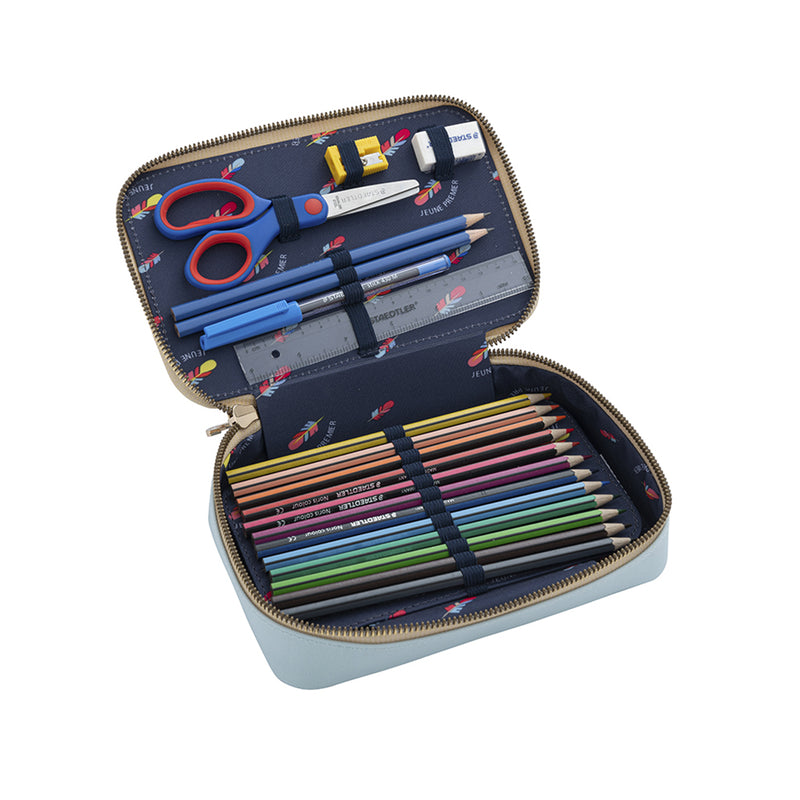 Klassisk fold-ud penalhus fra Jeune Premier i polstret udgave, som kan rumme alt til barnet skolegang i de første skoleår. Penalhuset har 2 separate rum, som er fyldt med Staedtler® skrive- og skoleredskaber, bestående af: 10 tusser, 12 farveblyanter, 2 klassisk blyanter, 1 viskelæder, 1 blyantspidser, 1 saks og 1 lineal. Måler: 20 x 7 x 12,5 cm. Alder: 5-12 år.