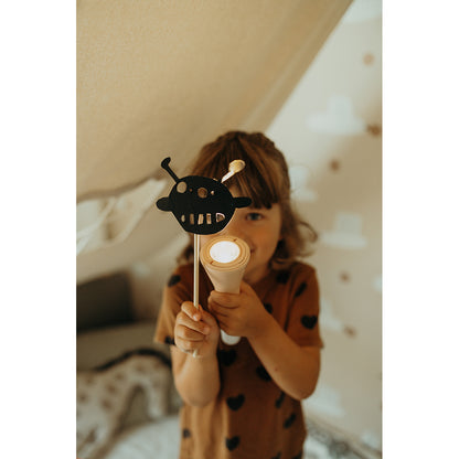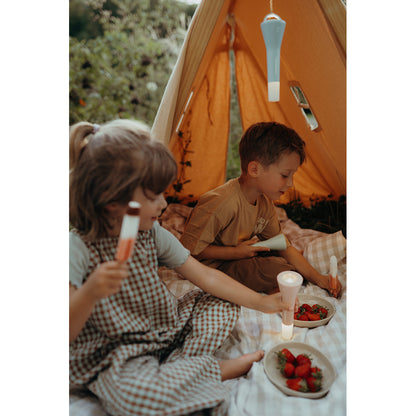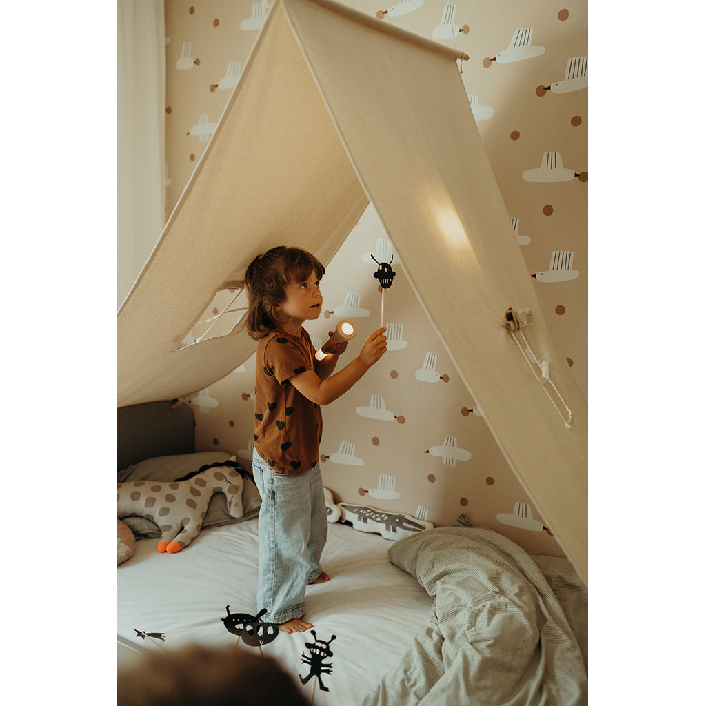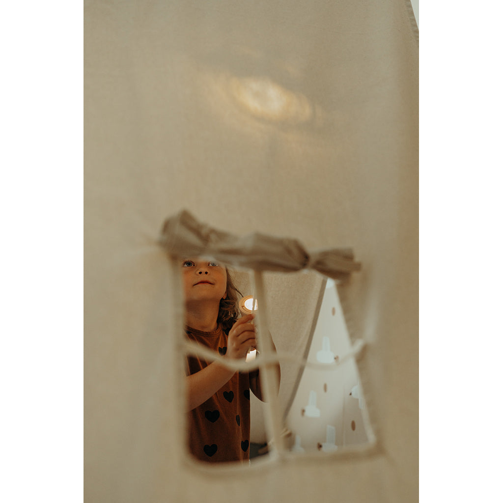 Oplev FLASHLIGHT, et sjovt tilbehør, der er designet til at udforske i mørket, berolige dine børn om natten og holde monstre på afstand. Denne lommelygte bliver en legekammerat, der garanterer timevis af sjov. Brug den som en klassisk lommelygte, placer den på en overflade for at skabe en varm atmosfære under godnathistorierne, eller hæng den op i en tipi med den indbyggede ring for at give den et ekstra strejf af magi!