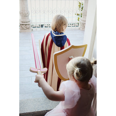 Sejt riddersæt fra Konges Sløjd, til leg og udklædning. Sættet består af et flot sværd og skjold i skum, som er dekoreret med blå og gyldne motiver. Begge dele er fremstillet i hårdt skum, så der kan leges og kæmpes helt uden skader. Børn elsker udklædning og rolleleg som er en naturlig del af deres udvikling. Og med denne serie er der rig mulighed for at slippe drømmene og fantasien løs. Fra 3 år.