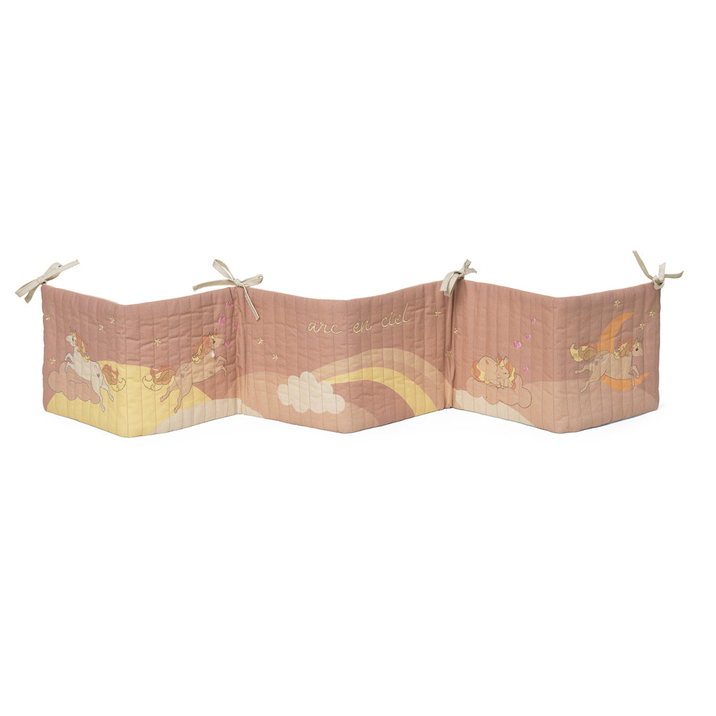 Den sødeste stofbog som kan bindes fast til tremmerne i tremmesnegen, så baby kan ligge og betragte de fine billeder af enhjørninger og regnbuer. Bogen er i fold-ud design og er velegnet til brug i barnevogn eller kravlegård, så det lille barn har noget at kigge på. Er fremstillet i 100% økologisk bomuld. En rigtig fin barselsgaveidé.