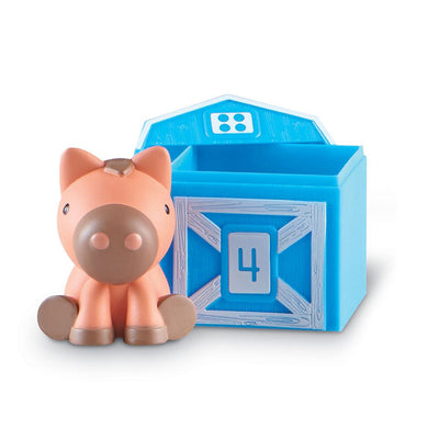 Dette sæt hjælper børn med at udvikle færdigheder inden for tælling, farver, sortering og parring gennem fantasifulde lege med bondegårdsdyrene. Sættet indeholder fem nummererede stalde i to dele, hver i en klar farve: rød, orange, blå, grøn og lilla. Hver stald kan åbnes og gemmer på et lille dyrefingerdukke – fx en venlig ko, gris, høne og flere.