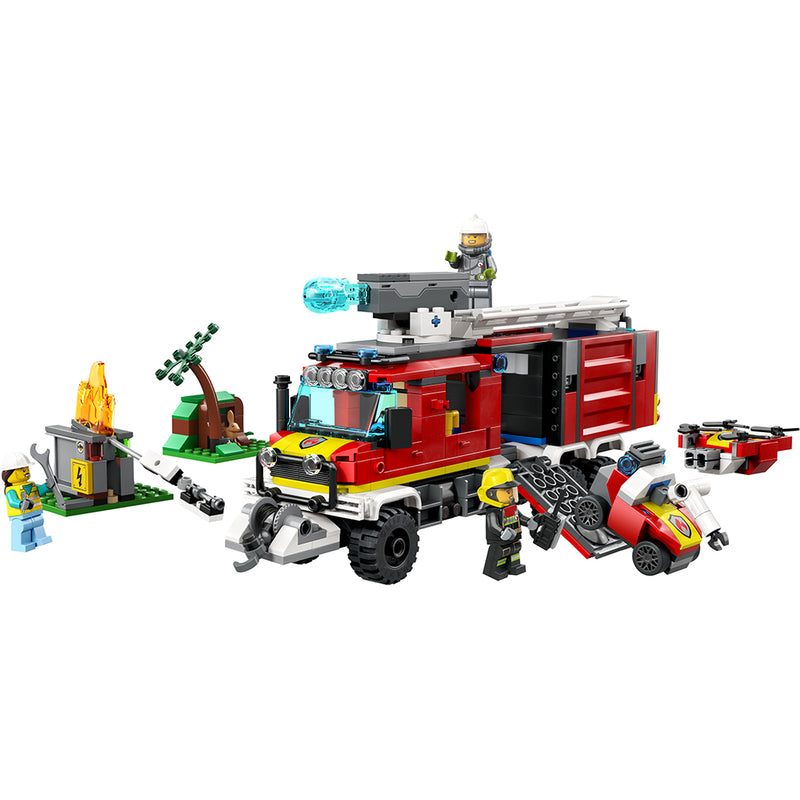 Børn kan slutte sig til LEGO® City brandfolkene ombord på den topmoderne Brandvæsnets kommandovogn. Dette køretøj rummer alt, hvad der skal bruges for at blive dagens helt! Brug bilens ildslukker og branddronen til at affyre særlige brandslukningselementer. Brug lastvognens spil til at flytte tunge genstande. Og hvis det bliver for varmt, så send den kørende drone ind med sin robotarm. Gør dig klar til action!