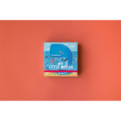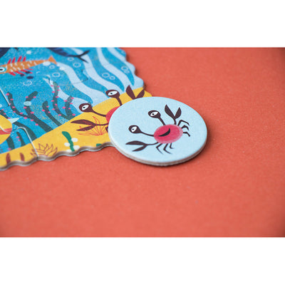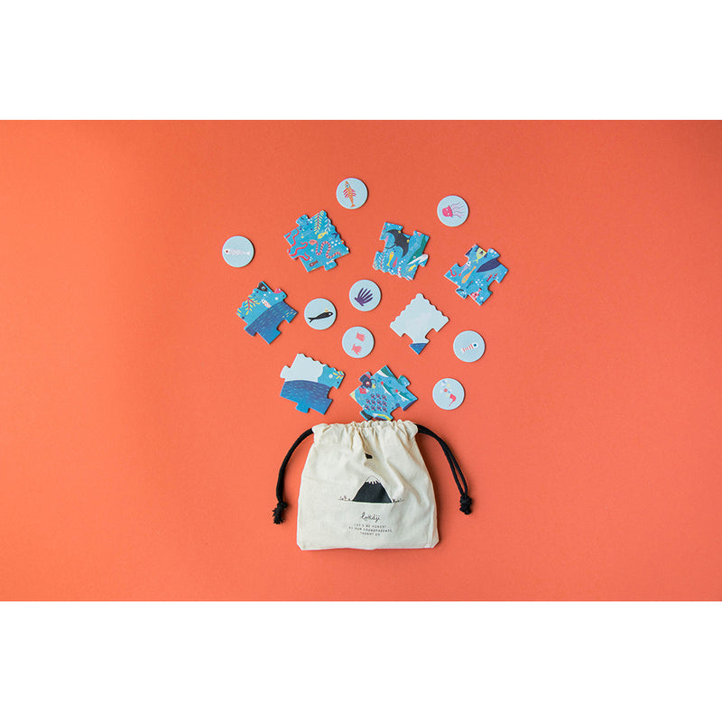 Dyk ned i Londjii havet med den store blåhval, hvor du kan møde med hajer, havdyr og den smukke havfrue. Et lille observations-puslespil i lommeformat med 36 brikker. Der medfølger små motiver og en pose, som kan bruges når puslespillet er lagt. Her skal man så trækket et motiv og finde de på selve det store motiv af puslespillet. Fra 3-5 år.