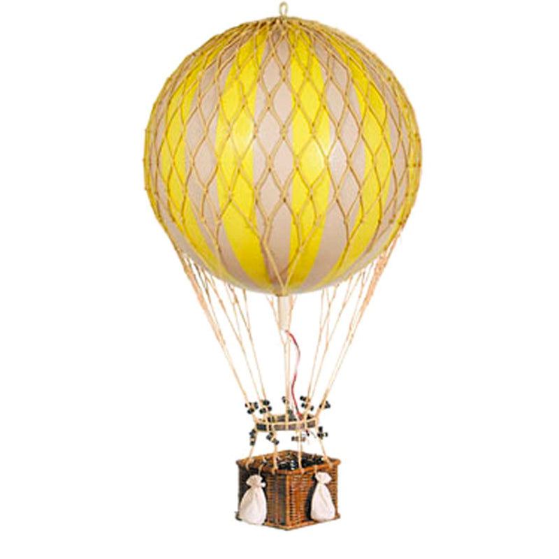 Flot og dekorativ luftballon i gul til pynt på børneværelset. Denne luftballon måler 32 cm i diameter, og fås i striber af gul og creme, med lille kurv nederst. Er perfekt til ophæng i loft eller vindue. Er designet efter original model med mange små og fine detaljer.