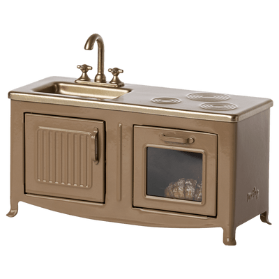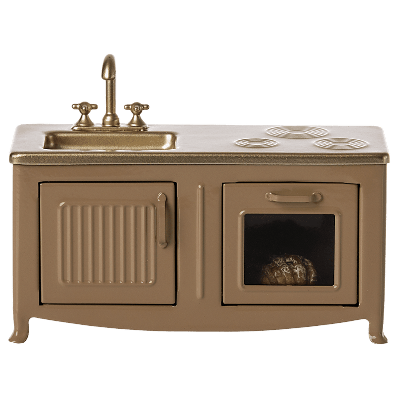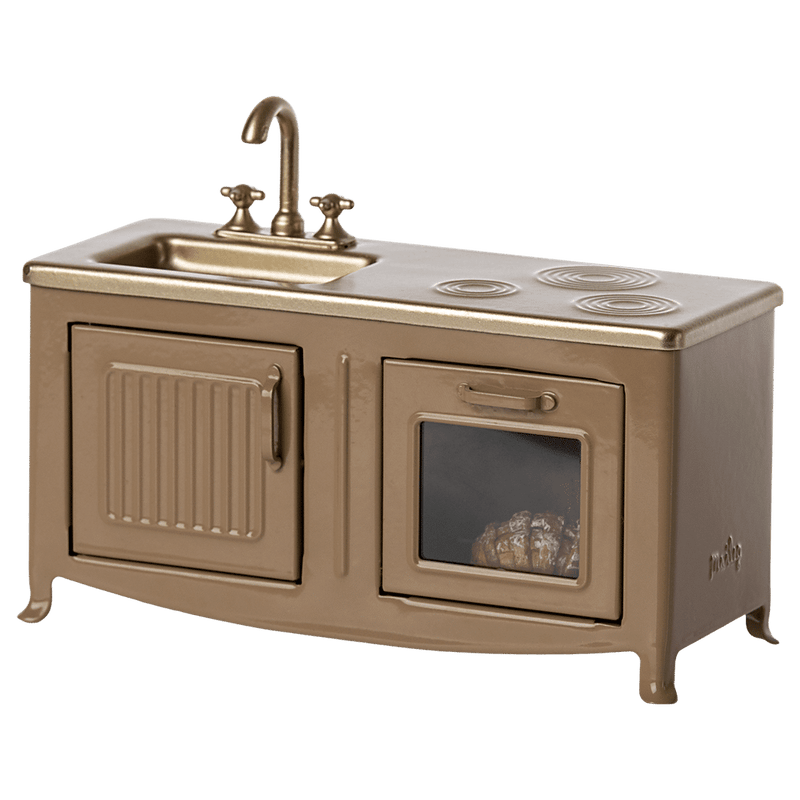 Hjertet i ethvert hjem er køkkenet. Dette metal køkken har en smuk farvetone og har mange fine detaljer såsom skabslåge, vask og en ovn med nybagt tærte. Den passer perfekt i størrelsen til musefamilien. Fra 3 år.