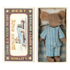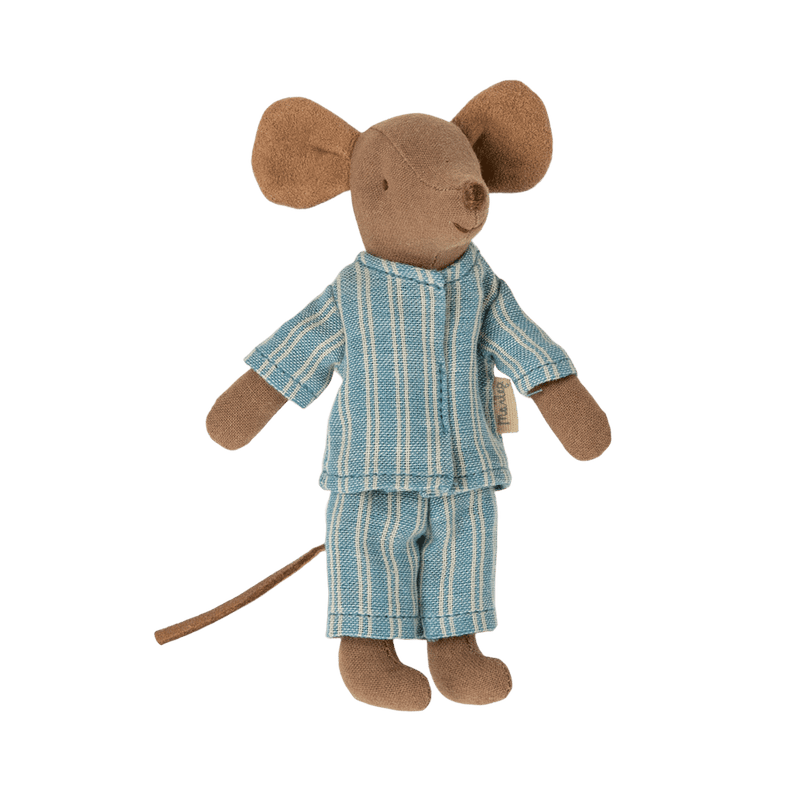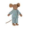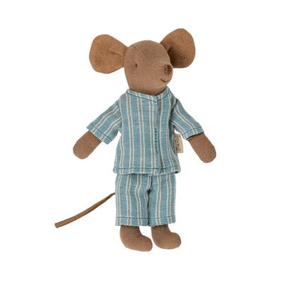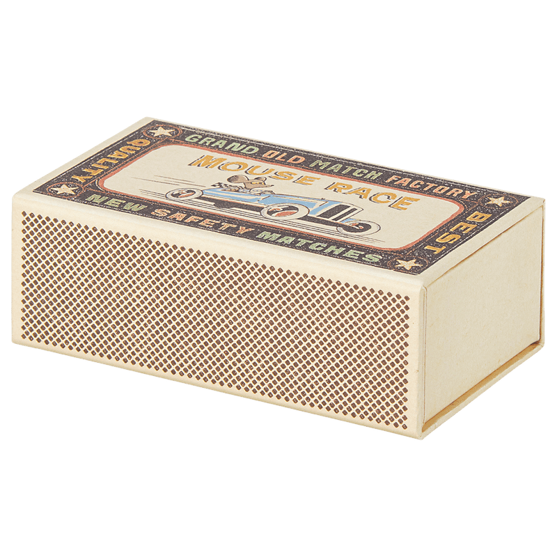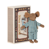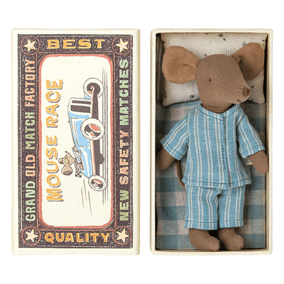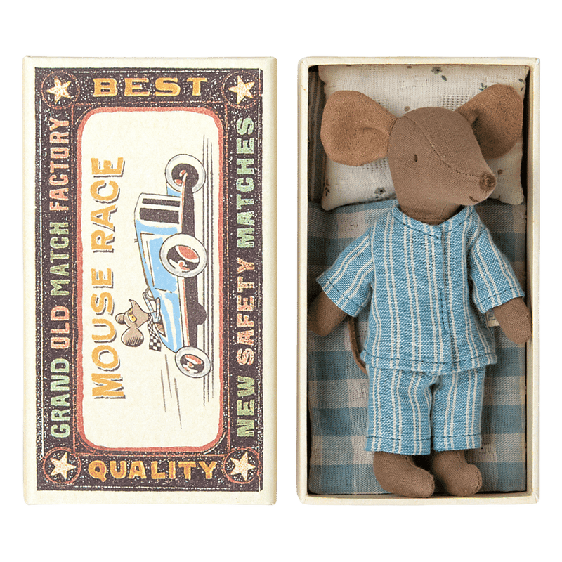 En klassisk Maileg-vare. Denne mus er klar til timevis af leg og kommer i en tændstikæske som fungerer som sin seng. Tøjet og sengetøjet kommer i unikke mønstre og smukke farver. Musen måler 13 cm. Fra 3 år.