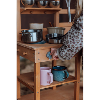 De justerbare komfurhåndtag giver legen et ekstra realistisk præg, hvor børnene kan føle sig som rigtige kokke, mens de udforsker deres omgivelser. Perfekt til både vand, jord og masser af mudder, inviterer køkkenet til sanselig og fantasifuld leg.
