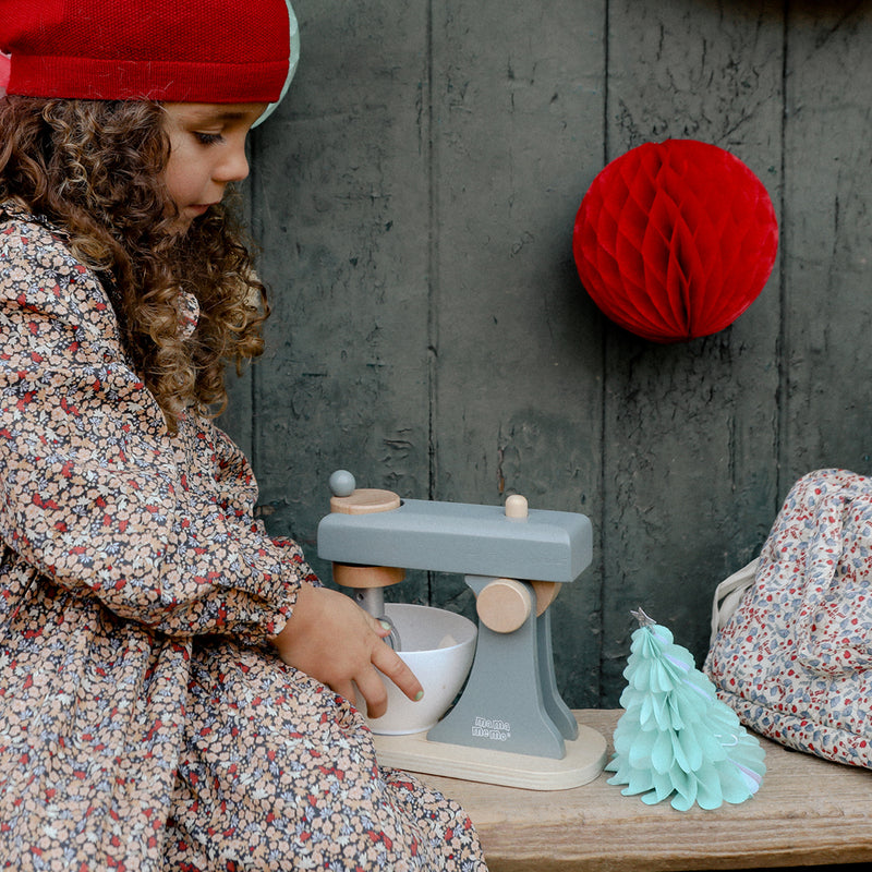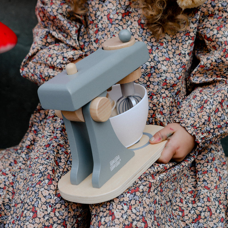 Praktisk røremaskine fra Mamamemo, til når der skal røres en dej sammen i legekøkkenet. Med til røremaskinen følger der en hvid plastikskål og 3 forskellige mixerblade. Mixerbladene virker ved at at dreje på det øverste håndtag. Derudover kan øverste del af maskine løftes, så det er nemmere at fjerne skålen.