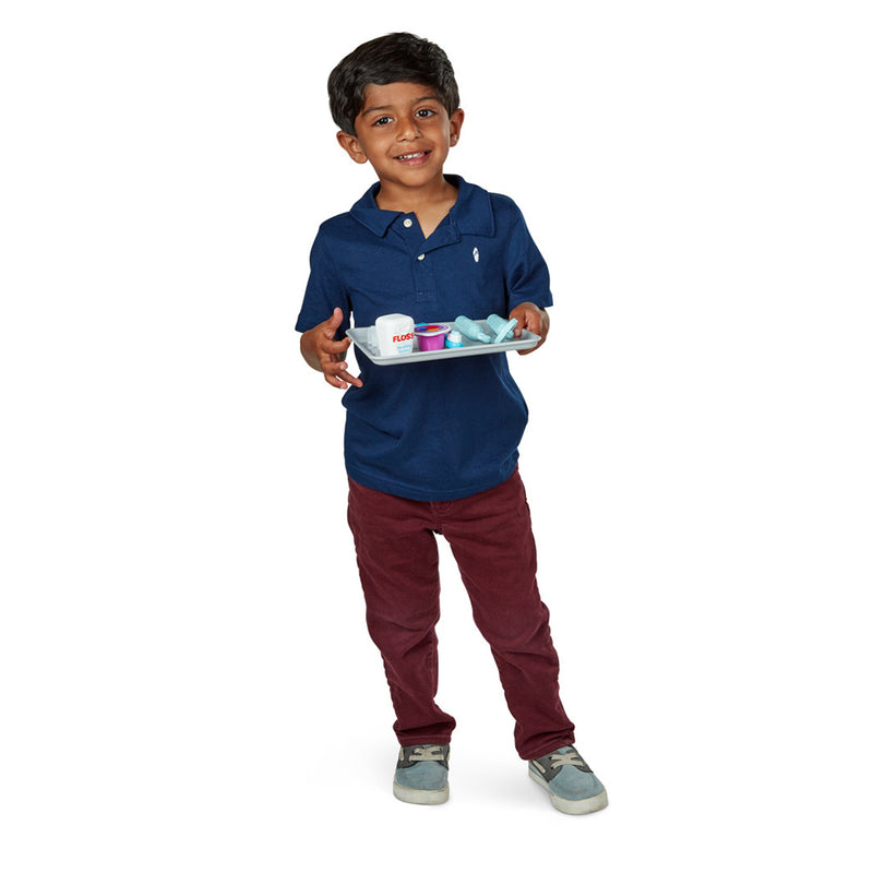 Åbn en munden og frem med bisserne - for nu kommer tandlægen! Med dette fine tandlægesæt fra Melissa & Doug, kan de små lege tandlæge og øve sig i at kigge efter huller og rokketænder. Dette tandplejesæt er med 25 dele og har et overdimensioneret tandsæt så unge tandlæger under uddannelse kan rense, behandle huller. Markér tandsættet med hulrumsmærkaterne, og brug derefter det vibrerende værktøj med udskiftelige poler- og borehoveder og tandbørsten til at rengøre. Sættet indeholder realistiske instrumenter bla. et spejl og en tandtråd, en tandskylleflaske og -kop, 2 gazepuder, 2 tandpoleringskopper og en instrumentbakke.