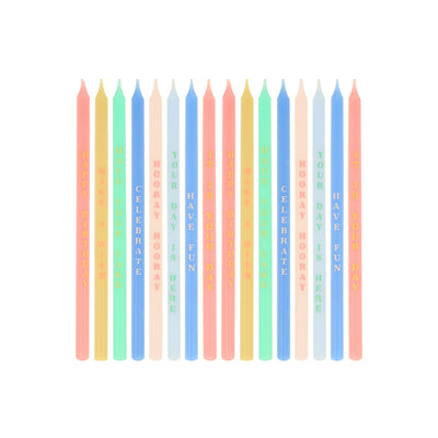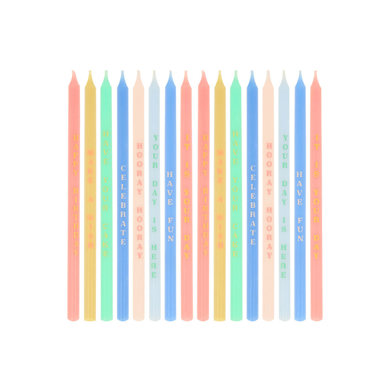 Giv din festkager eller desserter et særligt udtryk, med disse flotte kagelys der har festlige sætninger printet lodret ned af dem. Er oplagte at bruge til babyshower, jubilæum eller fødselsdage. Pakken indeholder 16 høje kagelys der kan stikkes direkte i kagen. Kagelysene måler ca. 14,5 cm.