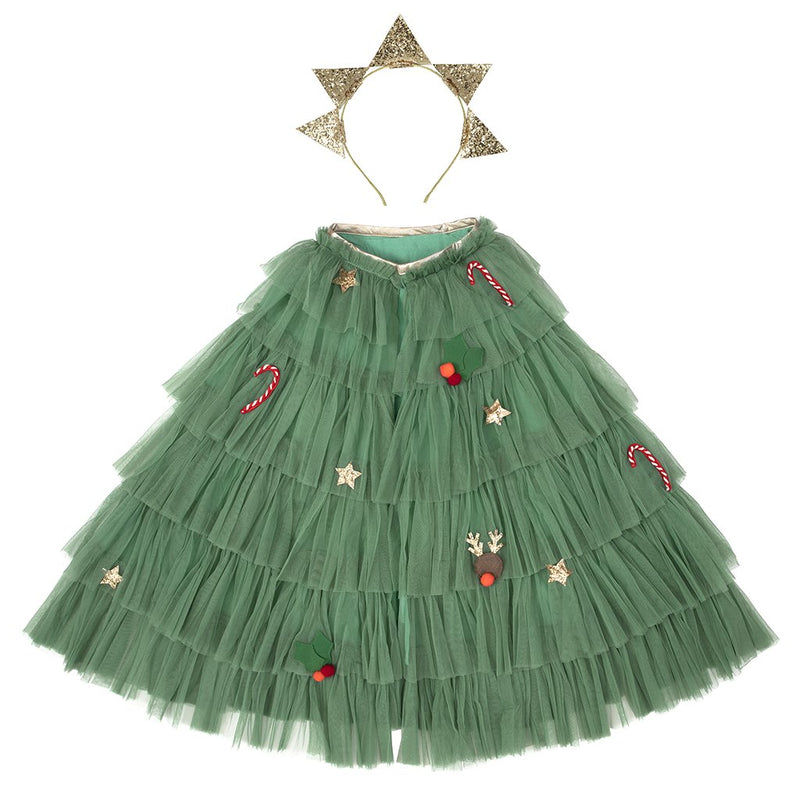 Fint kostume fra Meri Meri som kan forvandle ethvert lille barn, til det sødeste juletræ du nogensinde har set! Sættet består af en kappe som ligner et dekoreret juletræ samt en hårbøjle som danner stjerne. Perfekt til leg og udklædning, og det ultimative festtøj til juleaften. Fås i one-size og passer 3-6 år.