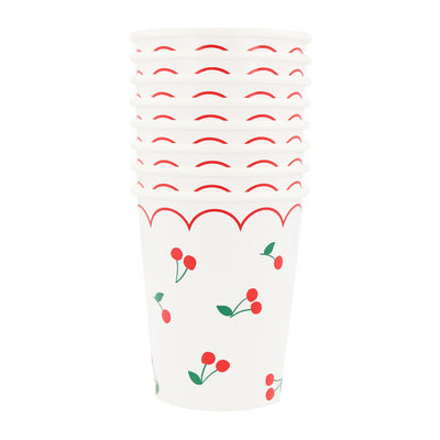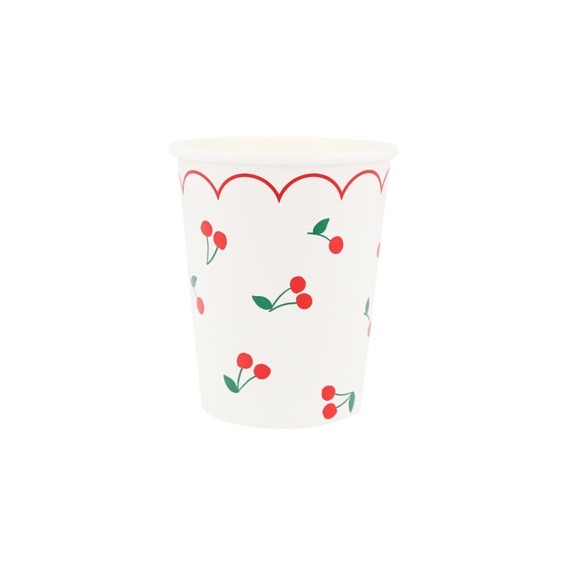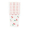 Sommer og sol...! Kirsebær er must-have-design, lavet til at give et frisk look til dine fester. Disse smukke mønstrede papirkopper, med røde flossede detaljer, vil tilføje et stilfuldt touch til enhver drink, du serverer. De er ideelle til havefester, picnic eller når du vil have et livligt præg.