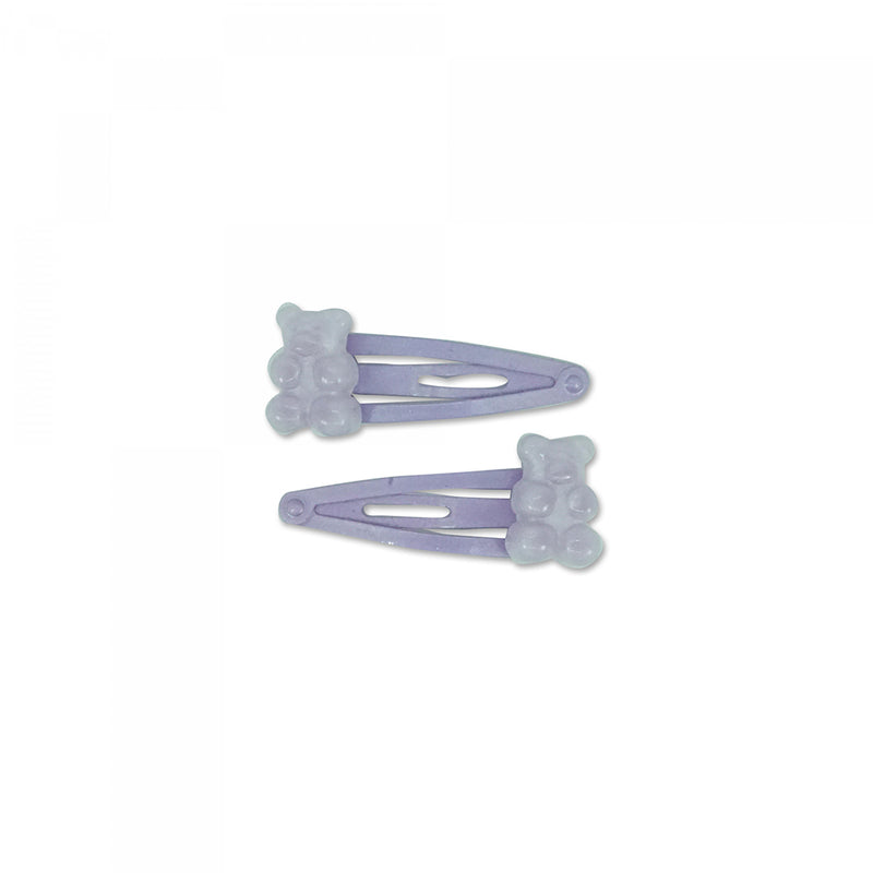 Fine klik-hårspænder fra Milk x Soda med motiv af vingummibamse/bjørn. Perfekt til brug i opsat hår. Fra 3 år.