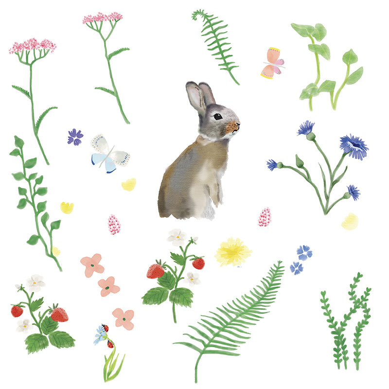 Flot wallsticker til at klistre på væggen som pynt fra Mimi' Lou. Motivet består af en kanin blandt blomster, græs og skovjordbær. Et sød motiv til børnværelset. Måler 17 cm.