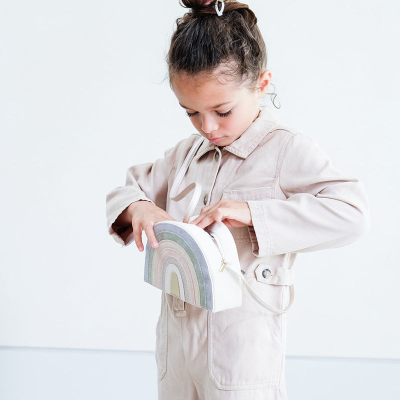 Sød taske til børn designet som en halvcirkel. Skuldertaske er off-white med strop, lynlås og skinnende, pastelfarvet regnbuedekoration. Stroplængde 48 cm. Alder: 3-8 år