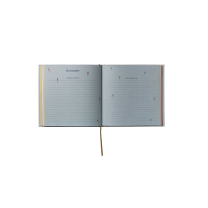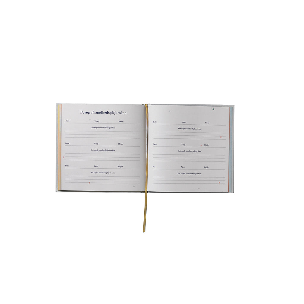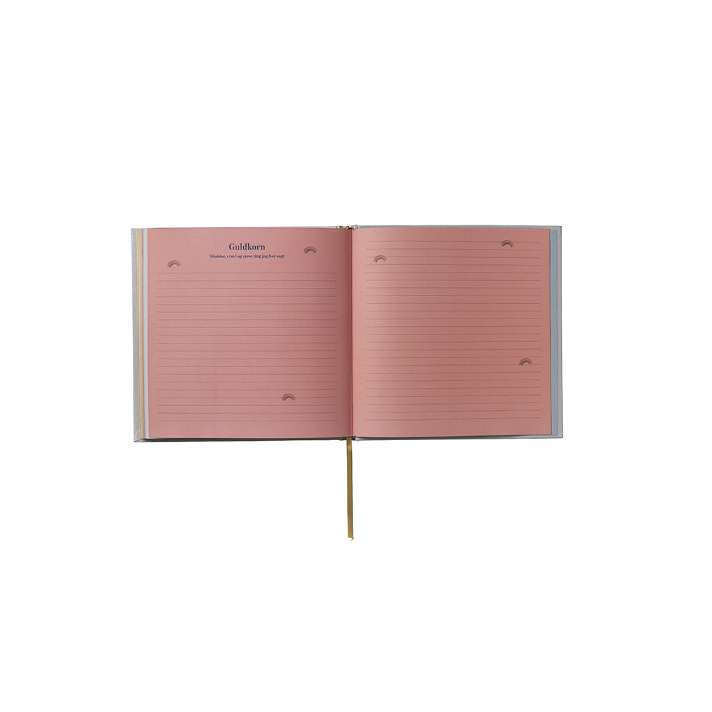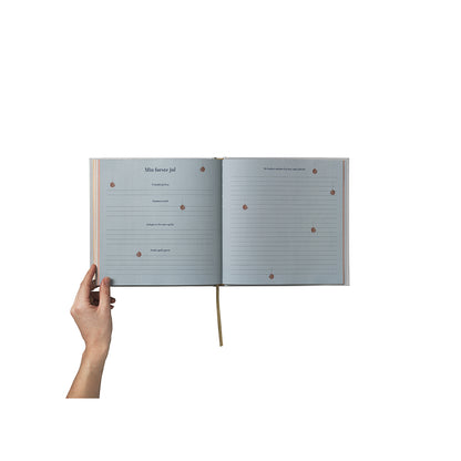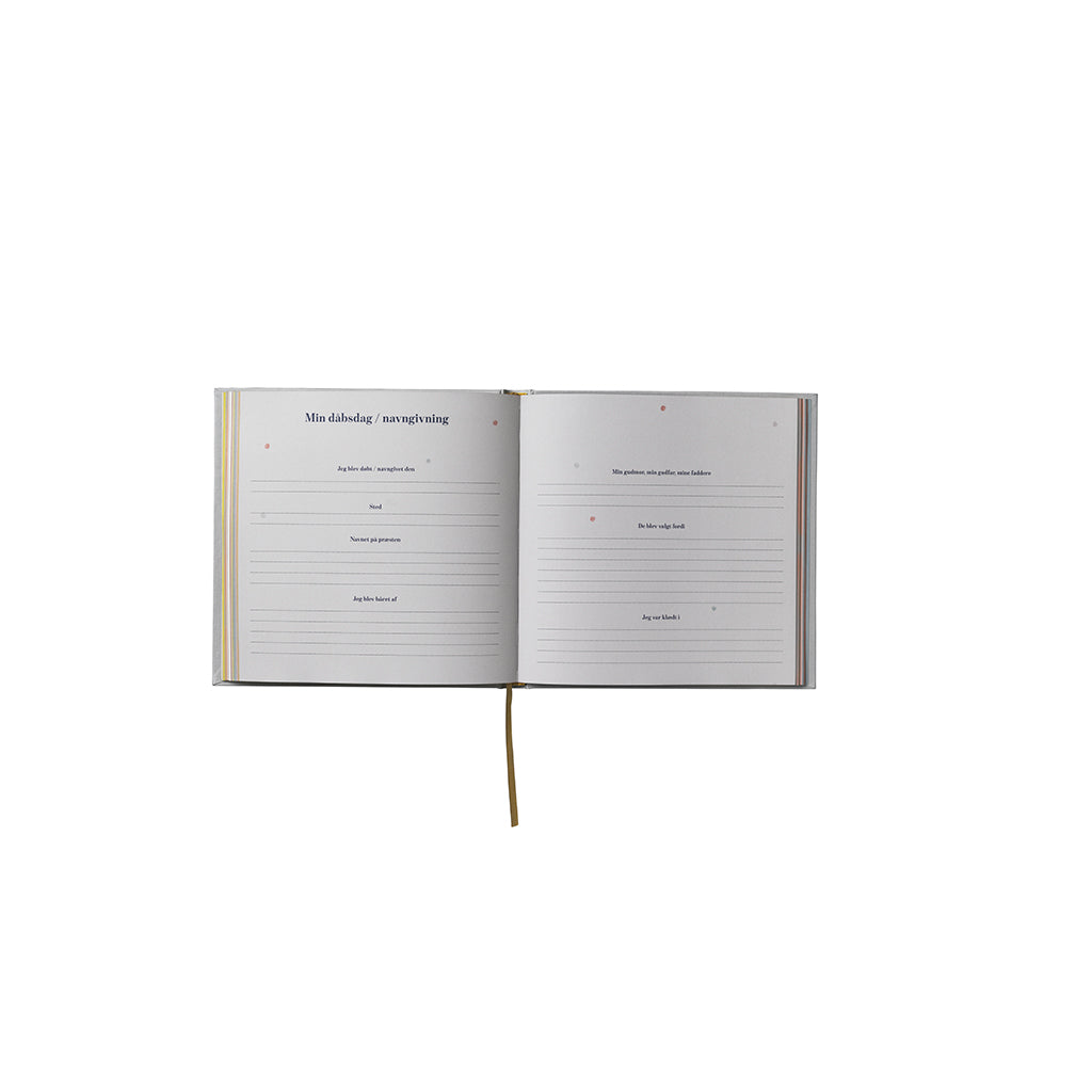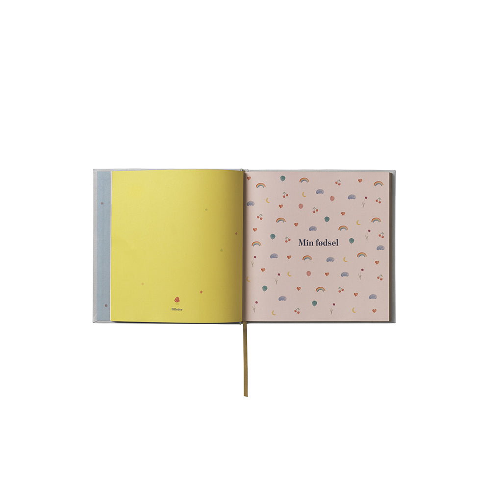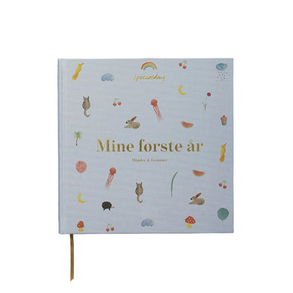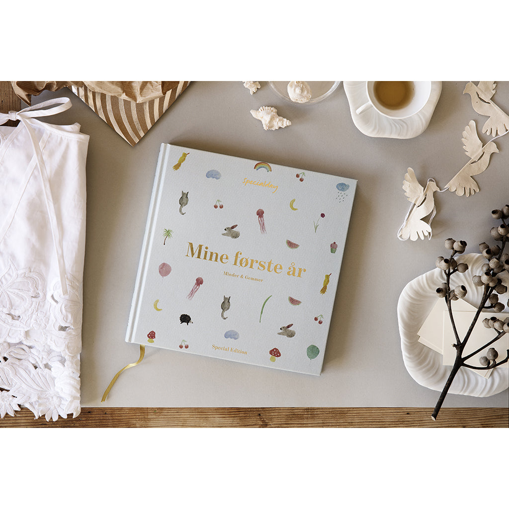 "Mine første år - Minder og Gemmer er babybog er i et smukt layout med søde små illustrationer og eksklusive gulddetaljer.