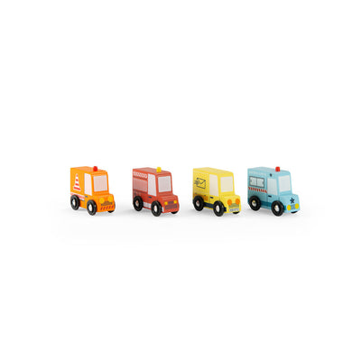Sæt med 4 kulørte retro varevogne i træ, specielt designet til de mindste børn. Varevognene er malet med små detaljer og PE- hjulene med aluminiumsakse kører jævnt på enhver plan overflade. Rengøring: Aftørres med en blød, fugtig klud. Materiale: Bøgetræ, PE, aluminium. Produkt: ca. 7,5 cm. Alder: 2-5 år