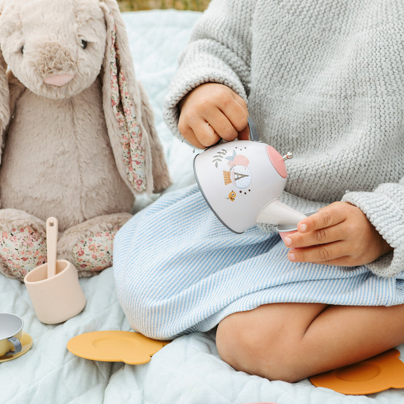 Metal testel i en fin kuffert. Delene er i pastelfarver med blomstermønster og små parisiske illustrationer af Lucille Michieli. Indeholder: tekande, serveringsbakke, 4 tekopper, 4 tallerkener, 4 underkopper og en opbevaringskuffert. Kan vaskes i hånden. Tåler IKKE opvaskemaskine