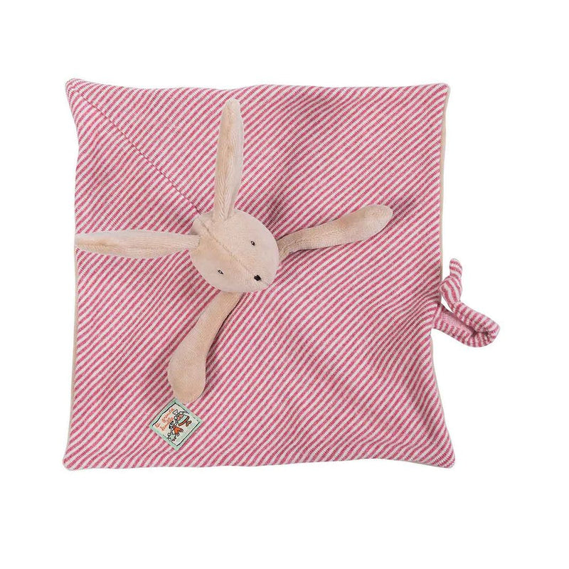 Dejlig og blød sutteklud med design som kaninen Sylvain i sine stribede jerseybukser. Foret med fløjl og let for små hænder at gribe fat i. Suttekluden har en rem til at fastgøre en sut.