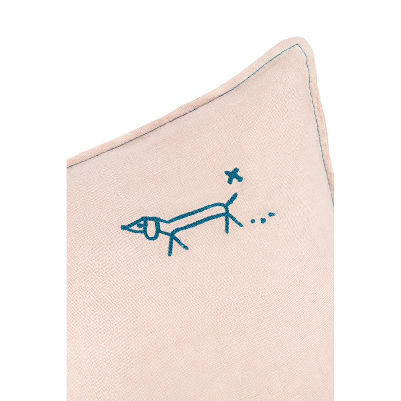 Broderet rektangulær pude fra Nobodinoz i vasket fransk hør med lille broderi af hund. Puden måler 50 x 30 cm og har fyld af økotex polyester. Tåler kun håndvask.