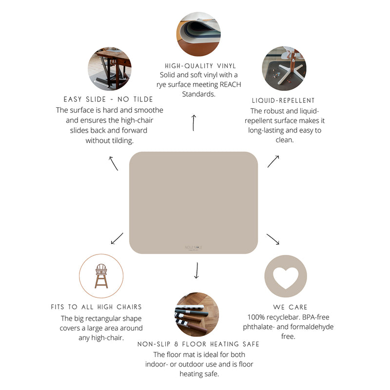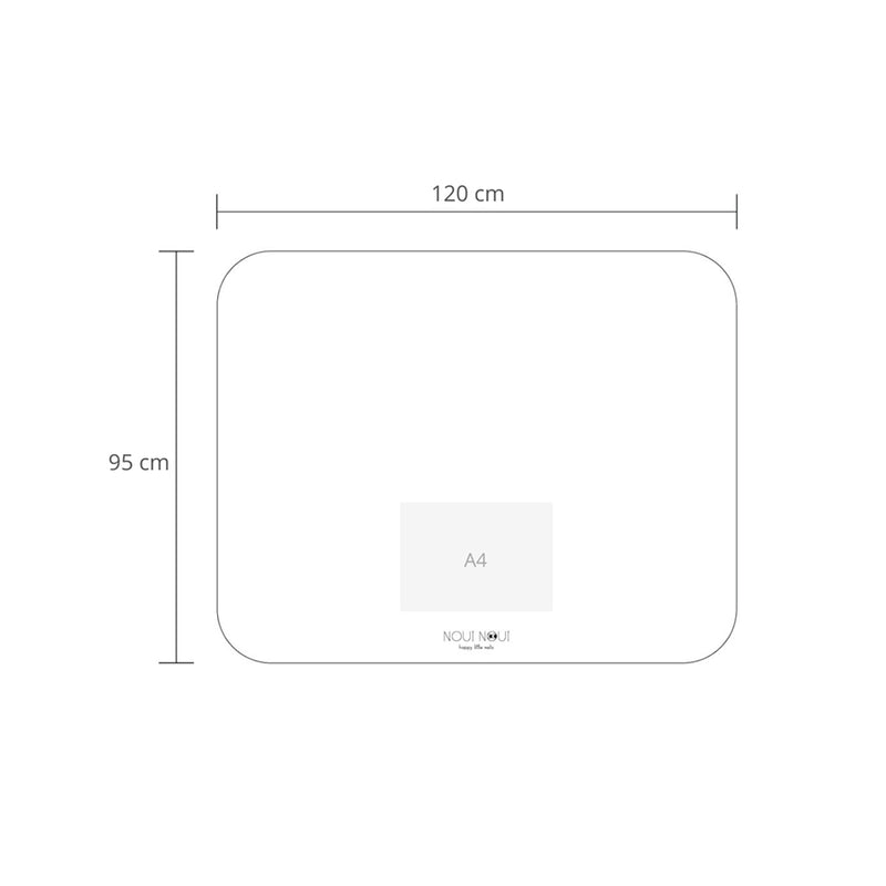 Praktisk skridsikker stoleunderlag til brug under højstol, børnemøbler, kontorstol eller kreative stunder, hvor underlaget beskytter trægulve, fliser og tæpper mod madrester og pletter. En god investering for enhver familie med små børn. Underlaget er fremstillet i høj kvalitet af blød vinyl og kan anvendes både indendørs som udendørs. Måler 120 x 95 cm. Kan rengøres med en fugtig klud og sæbe. Er velegnet til gulvvarme. Væske-afvisende.
