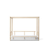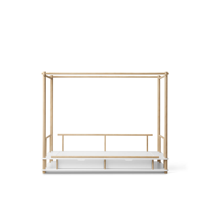 Sengen med rammen af eg kan sagtens i sit smukke håndværk med skjulte skruer og praktiske skuffer underneden stå alene, men konstruktionen kommer rigtigt til sin ret med en af de fire sengehimler, der er skabt til sengen. Sengen med sengehimmel indbyder til alverdens udtryk, scenarier og universer og skaber på en gang trygge rammer for natten og en platform for dagdrømmeri og leg i løbet af dagen.