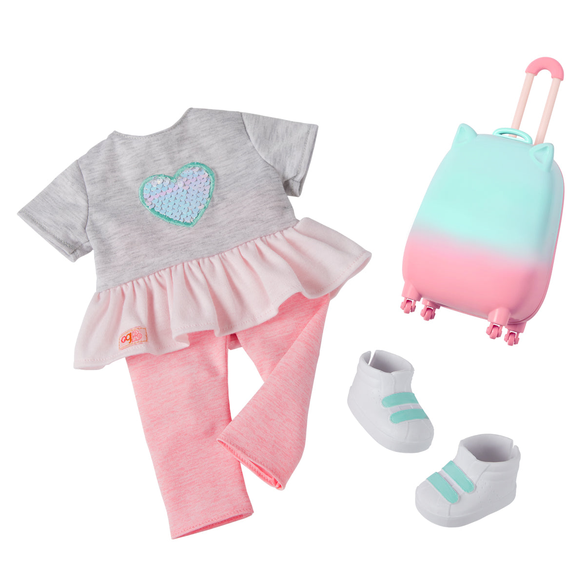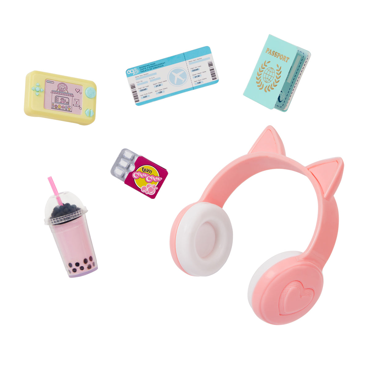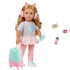 Linzi er iført en vendbar T-shirt med glitrende pailletter, pink bukser og søde sko – og hun er klar til afgang med sin farverige kuffert med katteører, rullende hjul og udtrækkeligt håndtag. Sættet indeholder også alt til en god rejse: hovedtelefoner, pas, boardingkort, tyggegummi, rejse-drik og en lille spillekonsol.