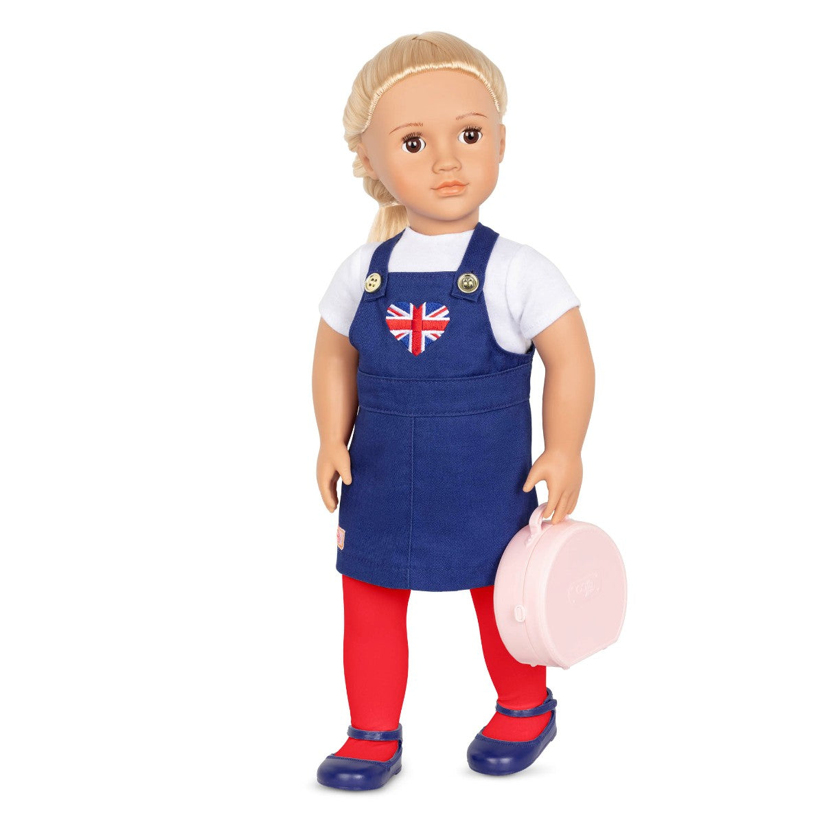 Hils på Olivia som er en af de populære dukker fra Our Generation. Olivia har pakket en weekend taske for at flyve en tur til London. Hun elsker at shoppe, og kan bruge mange timer på at kigge i forretningerne. Specielt tøjbutikker er hun glad for. Til dukken medfølger: Kjole, røde strømpebukser, hvid t-shirt, blå sandaler og en weekend taske.