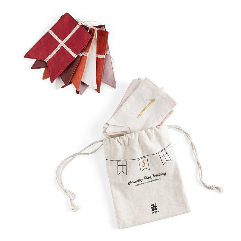 Charmerende flagranke fra Sebra i økologisk bomuld med 11 udskiftelige tal-flag og 6 dannebrogsflag i afstemte røde nuancer. En flot flagkæde der kan bruges til markering af særlige mærkedage. Måler: H: 102 L: 70 B: 75 cm.