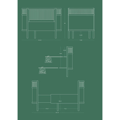 Sengen er beregnet til max. 15 kg. i øverste sengebundsindstilling og 80 kg. i den nederste.