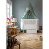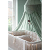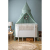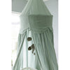 Skøn sengehimmel i certificeret bomuld, hvor toppen har et ekstra lag stof, der er formet i bløde buer. Kan placeres omkring sengen, bruges som legetelt, eller anvendes i haven på en sommerdag. Sengehimlen har draperet stof med et rigtig flot fald, og er fremstillet af 100% økologisk bomuld og bøjle af metal.