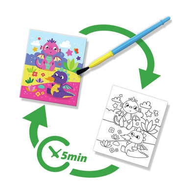 Oplev magien ved at farve med vand, og mal de hvide områder på hver af bogens sider ved hjælp af en magisk pensel - helt uden griseri med farver. Fyld blot penslens beholder med vand og tag med til fantasiens verden. Kan bruges igen og igen, fordi illustrationerne forsvinder, når siderne tørrer.