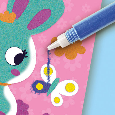 Skab sandkunst med muntre dyr ved at påføre farvet sand på skabelonkortene.