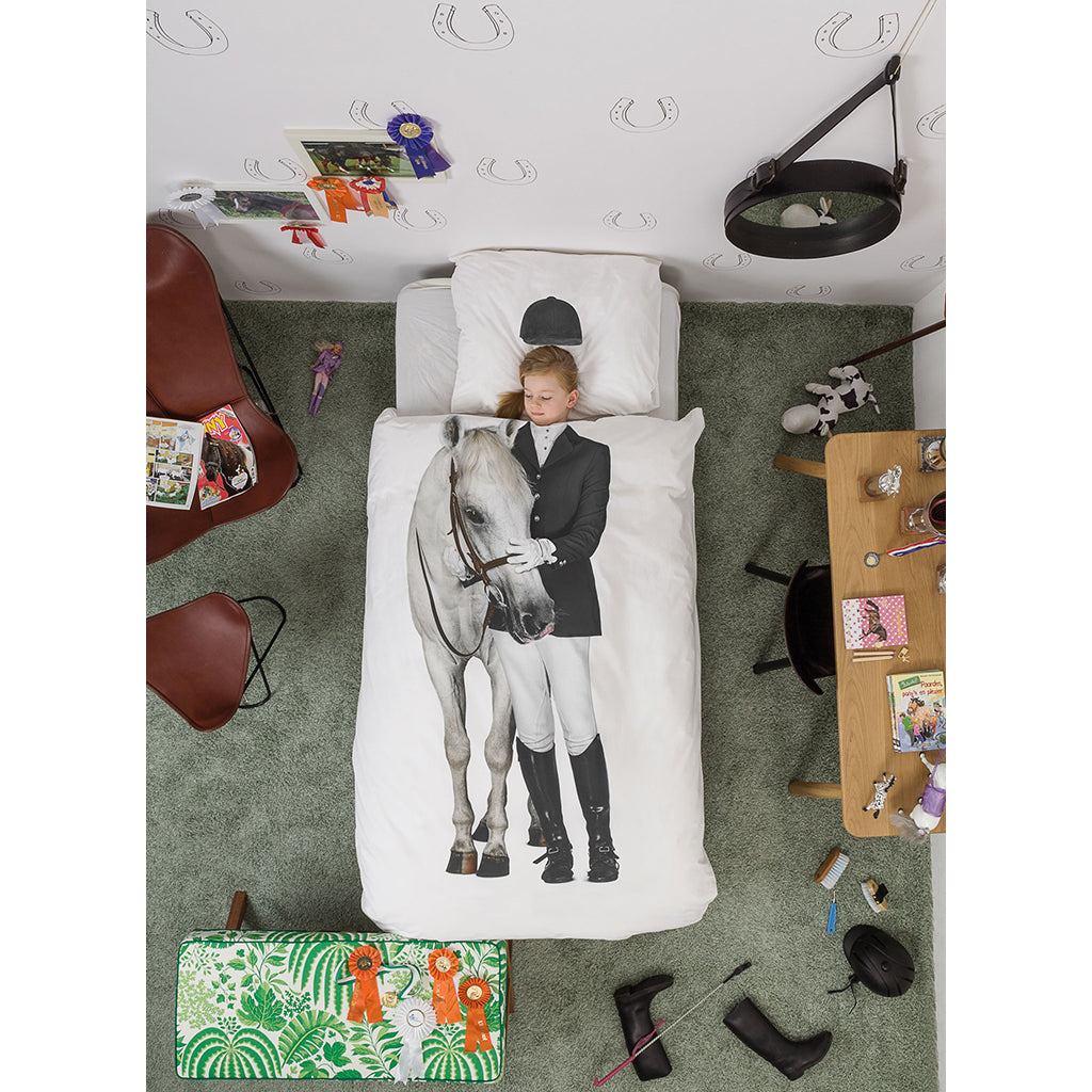 Kvalitetssengetøj fra Snurk med fotografisk print til hesteglade børn. Med dette sæt sengetøj har du mulighed for at hoppe i seng med hesten Amazone, og drømme dig hen som rytter. På dynebetrækket er der print af selve hesten og rytters krop, og på pudebetrækket er der print af ridehjelm. Alt hvad du skal gøre er at krybe under dynen for at danner en flot helhed.