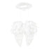 Smukt vingesæt og hårbøjle med glorie fra Souza, der på ingen tid kan forvandle ethvert barn til den fineste lille engel. Er perfekt til brug i leg og udklædning. Vingerne er fremstillet med fjer og kunstig pels, som giver det smukkeste udtryk. Vingerne sidder sammen (kan ikke skilles ad) og sættes på armene ved hjælp af 2 elastiske stropper der sidder på indersiden af vingerne.