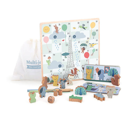 Vilac multispil i træ er en skøn spilæske til de mindste, illustreret af Sarah Betz. Her får du hele fire klassiske spil i én æske: gåsespil, stigespil, fiskespil og bingo – alle med søde trædyr som brikker.