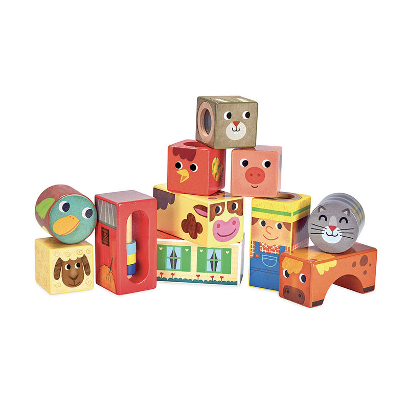 Lækre træklodser fra Vilac i flotte farver og med bondegårds tema, som kan stables på alverdens måder. Hver klods har en lyd, så ryster man dem - bliver de til rasle klodser.