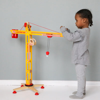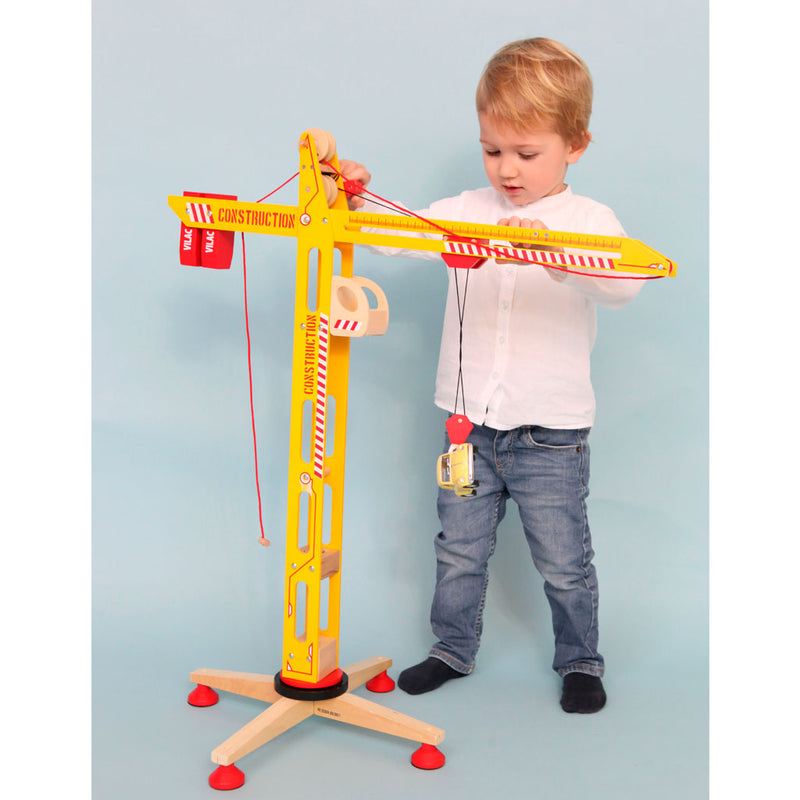 Super flot kran i træ fra Vilac til den lille bygherre som elsker leg med biler og byggepladser. Drej kranen i position og sænk magneten. Træk lasten op og sænk den ned på ladet af en truck eller en trailer. Med en kran som denne, kan gulvet i legeværelset på ingen tid, blive omdannet til en byggeplads med masser af legemuligheder. Til kranen medfølger der figur af kranfører og små elementer til at løfte.